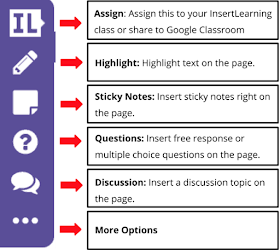 Image result for insert learning logo InsertLearning is a GoogleChrome website extension perfect for creating blended learning lesson plans, as that it allows you to turn any webpage into an interactive lesson. After downloading the extension, InsertLearning will provide a tutorial for the toolbar and an example on how to use the tool.